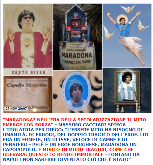 Cara Giovanna, permettermi di dissentire in questa occasione. Ho sempre ritenuto Maradona il miglior calciatore, di gran lunga migliore di Pelè, senza dubbio, ma per me gli eroi sono altri. Sono quelli che hanno fatto la 15-18 per citarne alcuni. Gravissima è poi questa affermazione, se è veramente attribuibile al professor Cacciari, spero di no, a proposito del suo “pensiero veloce” (sic!). Se io fossi il rettore dell’ateneo dove questo signore insegna, se insegna, io gliene chiederei conto. Gravissimo è infine il fatto che in tempo di Covid si siano viste le scene che si sono viste a Napoli, senza che nessuno le stigmatizzasse. Da queste parti la morte di Maradona è cosa passata nel dimenticatoio da parecchio tempo perché nel frattempo sono morti di Covid molti altri. Quando ci domandiamo perché il nostro non è considerato un paese serio, dovremmo guardare a questa occasione e a molte altre simili, invece di lamentarci. Se non ci fa sparire l’epidemia, noi moriremo di momenti di rincoglionimento, anche intellettettuale, di questa tipologia e francamente la perdita non sarebbe da piangere. Sic!